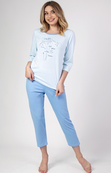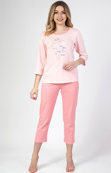 Жіноча бавовняна піжама з кольоровим принтом спереду. Футболка з рукавом 3/4 і напівкруглим вирізом. Штани формені довжиною до литок. Склад: 100% бавовна.