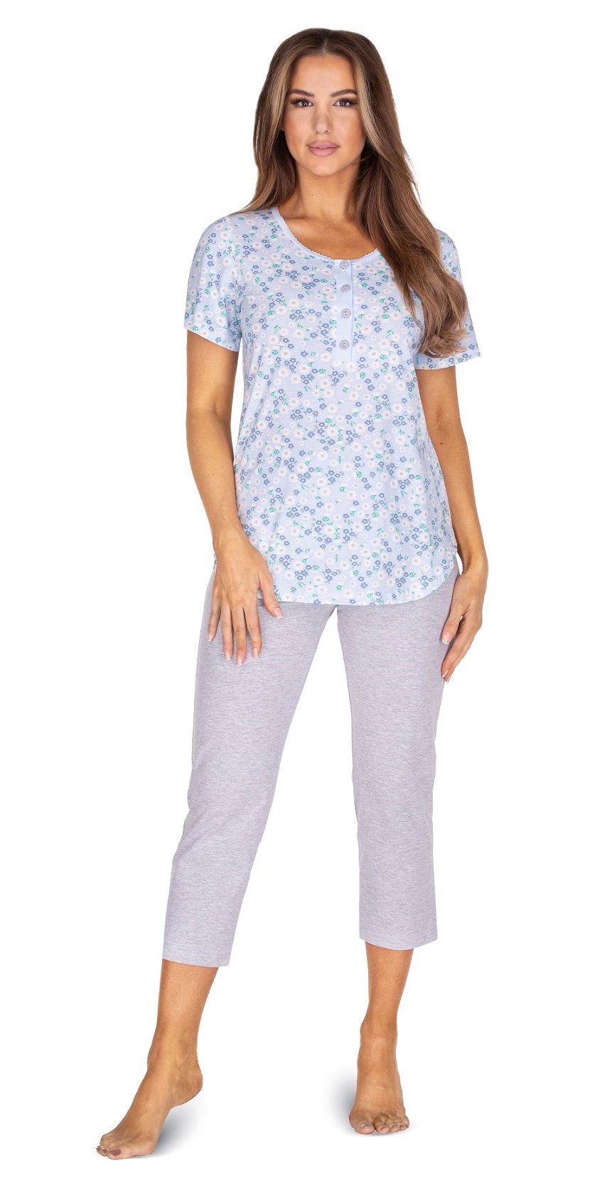 Жіноча піжама з високоякісної бавовни. Блуза з коротким рукавом, зверху на гудзиках, з малюнком. Однотонні штани в сіточку. Склад: 100% бавовна.