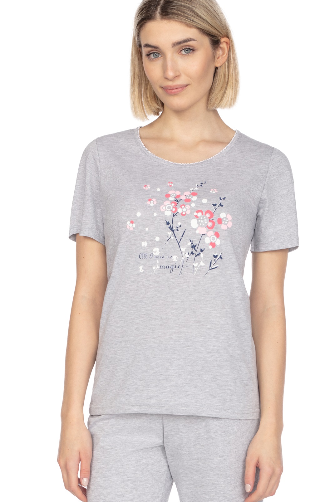 Жіноча бавовняна піжама. Футболка з коротким рукавом, прикрашена ніжним малюнком. Штани формені типу рибалки. Склад: 100% бавовна.