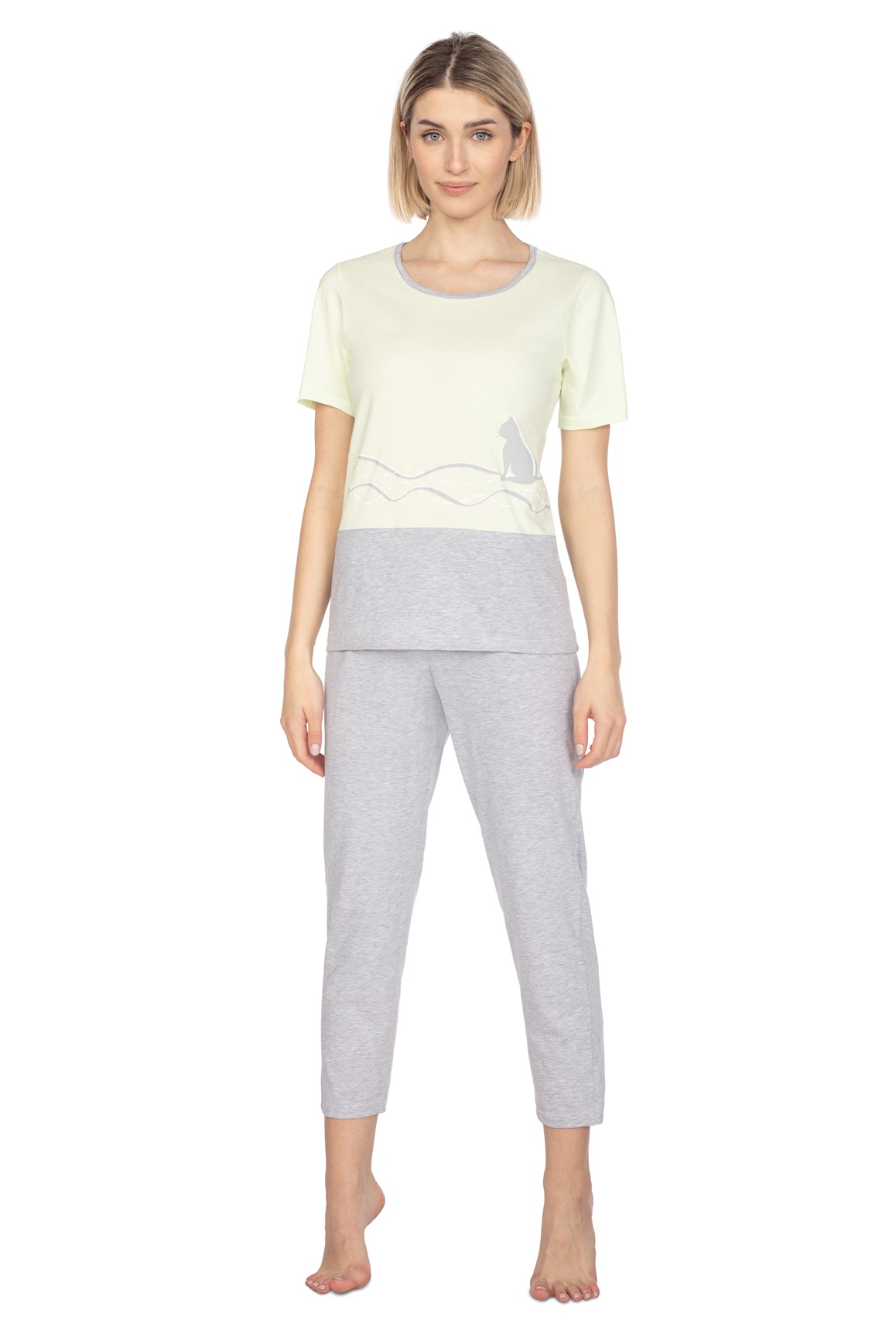 Жіноча піжама з високоякісної бавовни. Блуза з коротким рукавом декорована візерунком, рибальські штани формені. Склад: 100% бавовна.