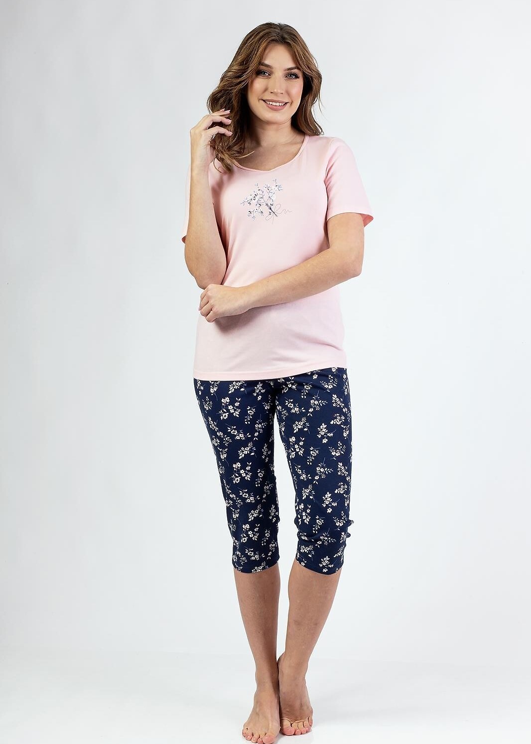 Жіноча піжама з високоякісної бавовни. Футболка з витонченою аплікацією на грудях, короткими рукавами, напівкруглим вирізом. Штани в стилі капрі з малюнком і еластичним поясом, обробленим бавовною. Склад: 100% бавовна.