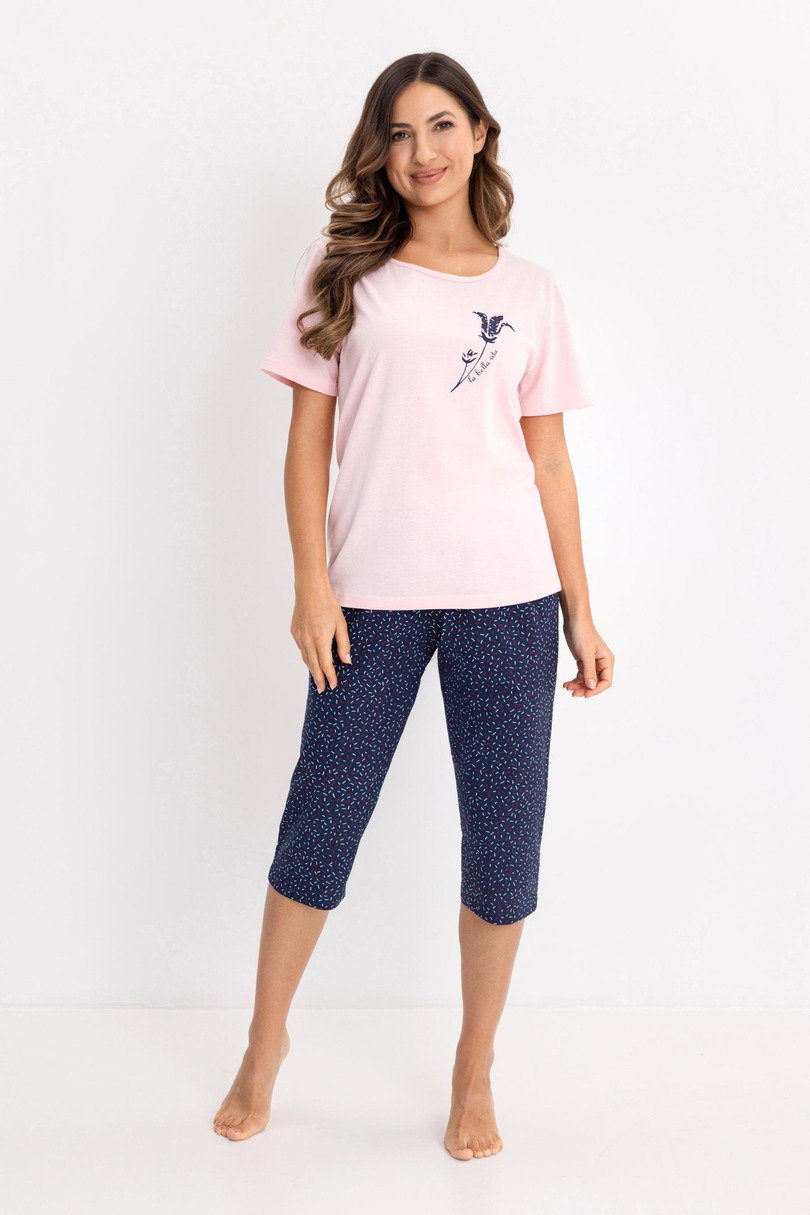 Жіноча бавовняна піжама, м'яка, приємна на дотик і забезпечує комфорт навіть у теплі ночі. Однотонна футболка має принт спереду та круглий виріз горловини. У комплекті штани з візерунком до коліна. Склад: 100% бавовна.