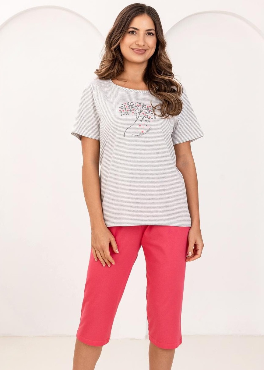 Ці жіночі бавовняні піжами забезпечують тепловий комфорт і приємні відчуття на дотик. Футболка в смужку з короткими рукавами має круглий виріз горловини та декоративний принт. У комплект входять однотонні штани довжиною 3/4. Склад: 100% бавовна.
