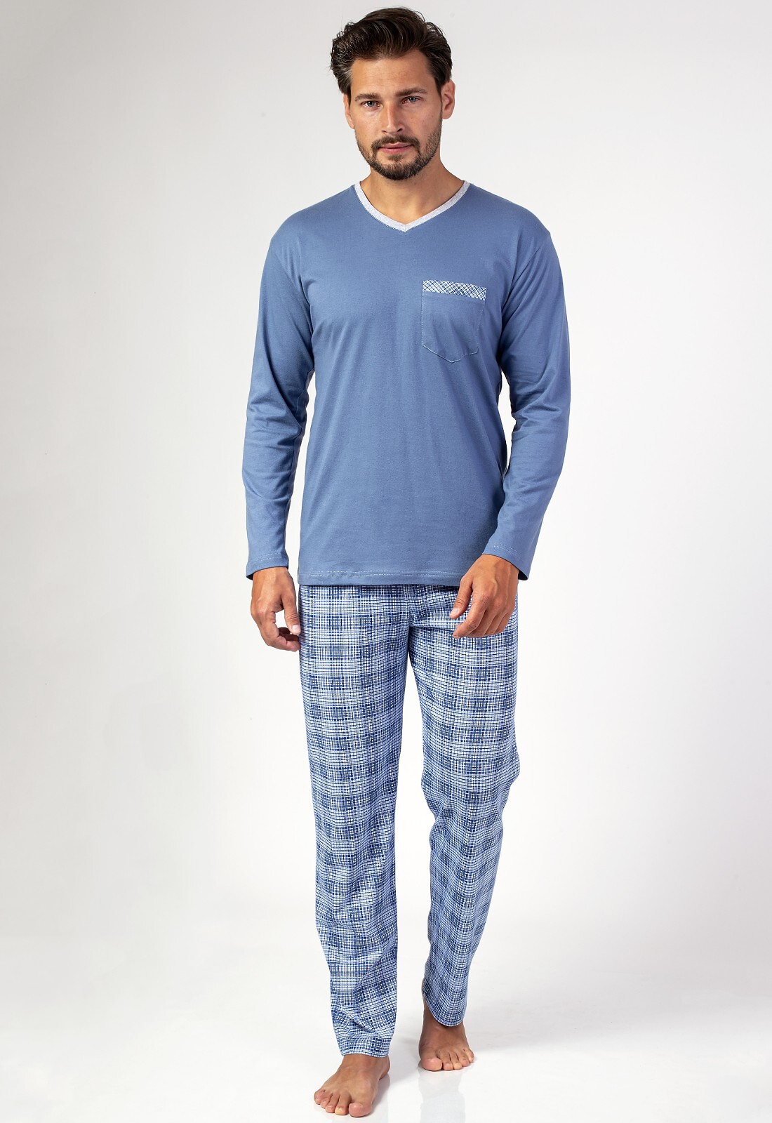 Бавовняна чоловіча піжама. Футболка з довгим рукавом, V-подібним вирізом і кишенею на рівні грудей. Довгі брюки з малюнком. Склад: 100% бавовна.
