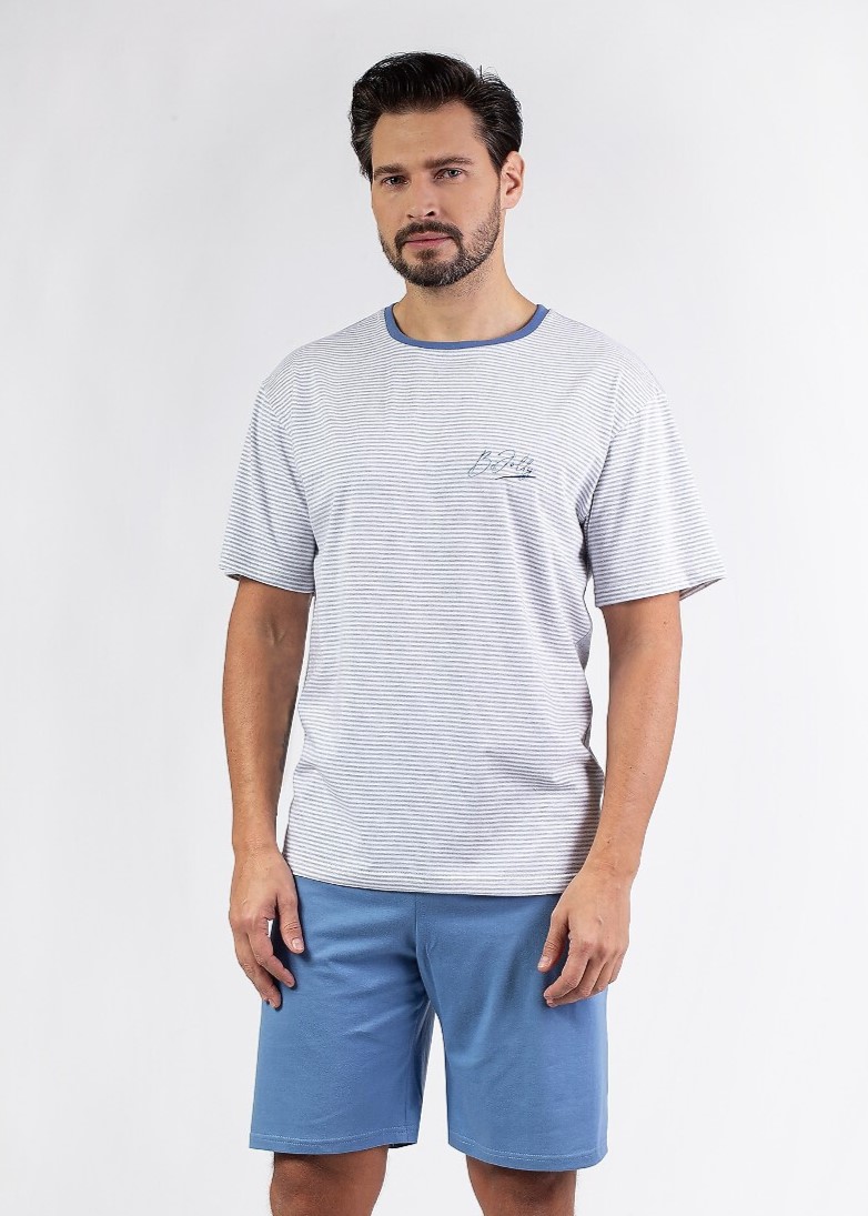 Чоловіча піжама з високоякісної бавовни. Футболка з короткими рукавами та круглим вирізом у дрібну смужку. Невелика аплікація на грудях. Короткі однотонні шорти. Склад: 100% бавовна.