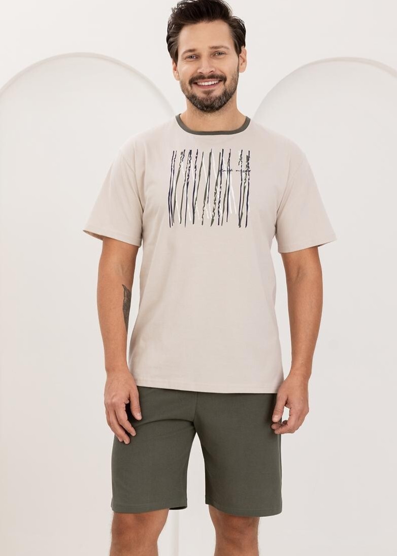 Чоловіча бавовняна піжама – м’яка, дихаюча та приємна для шкіри. Футболка з короткими рукавами, круглим вирізом горловини та принтом спереду. Однотонні шорти з еластичним поясом з бавовняною обробкою. Склад: 100% бавовна.