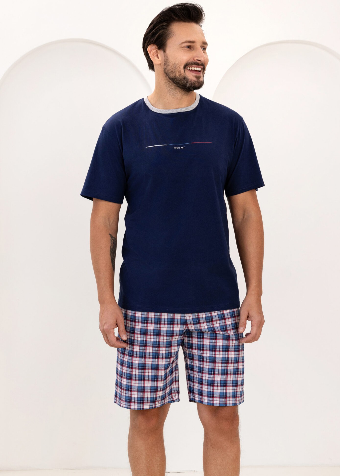 Чоловіча піжама з короткими рукавами. Верх однотонний з ніжним принтом, а круглий виріз горловини оброблений контрастною окантовкою. Шорти мають модний картатий візерунок і еластичний пояс. Склад: 100% бавовна.