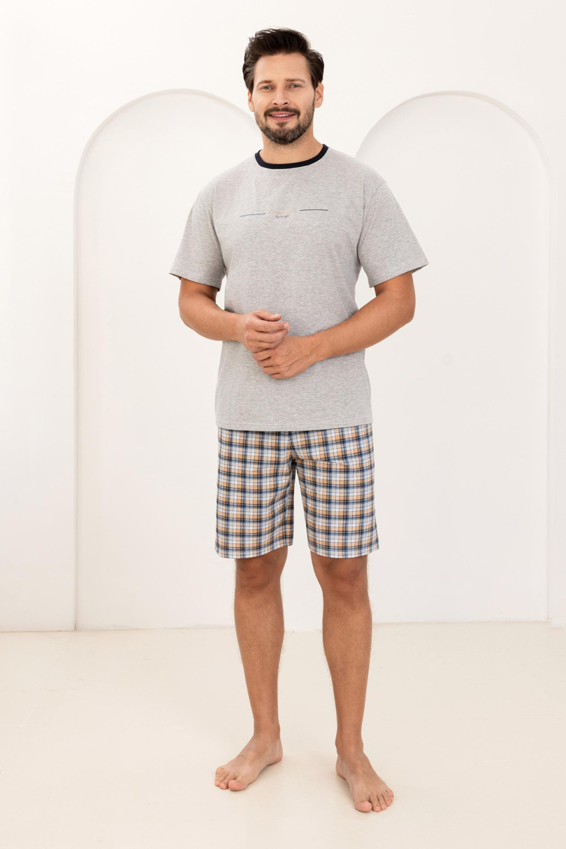 Чоловіча піжама з короткими рукавами. Верх однотонний з ніжним принтом, а круглий виріз горловини оброблений контрастною окантовкою. Шорти мають модний картатий візерунок і еластичний пояс. Склад: 100% бавовна.