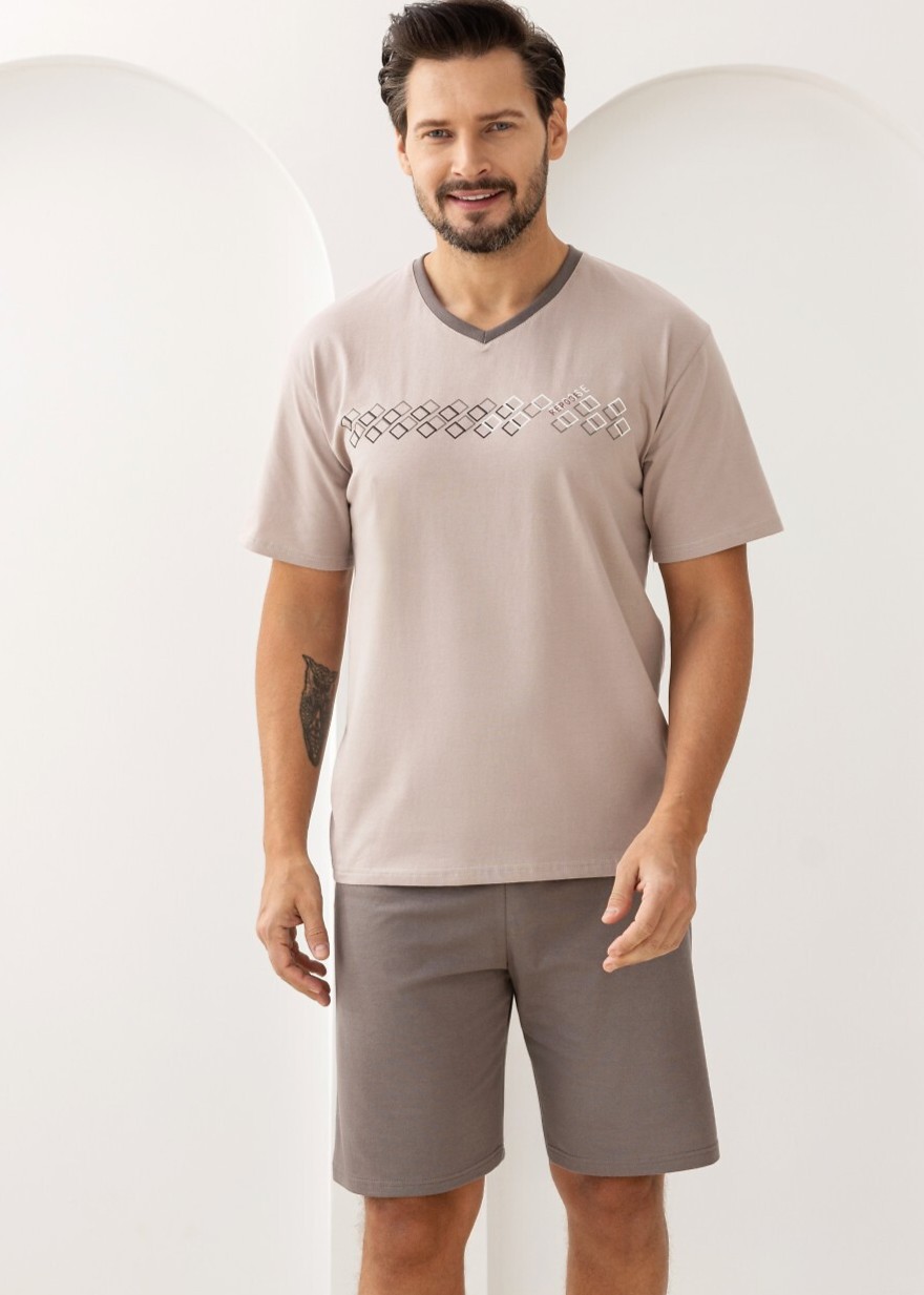 Чоловіча бавовняна піжама – м’яка, дихаюча та приємна для шкіри. Футболка з короткими рукавами, V-подібним вирізом та дрібним принтом спереду. Короткі однотонні шорти з еластичним поясом з бавовняною обробкою. Склад: 100% бавовна.