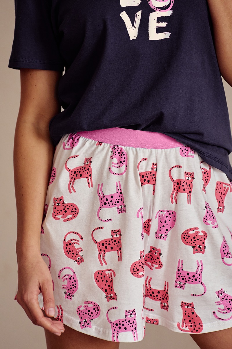 Жіноча піжама з коротким рукавом з однотонної ніжної бавовни. Спереду прикрашена кольоровим принтом. У комплект входять короткі шорти з еластичним поясом. СКЛАД: 100% БАВОВНА
