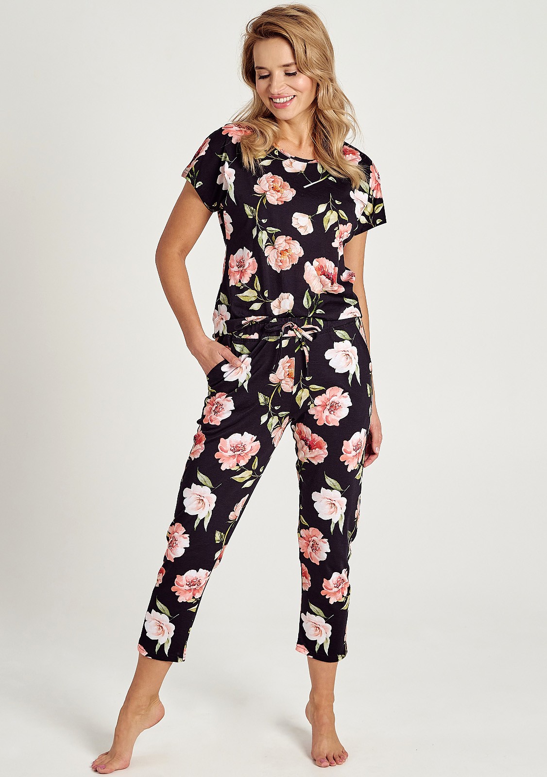 Жіноча бавовняна піжама. Візерунок з великими квітами. Короткий рукав, брюки 7/8, шнурок на талії. Склад: 100% бавовна.