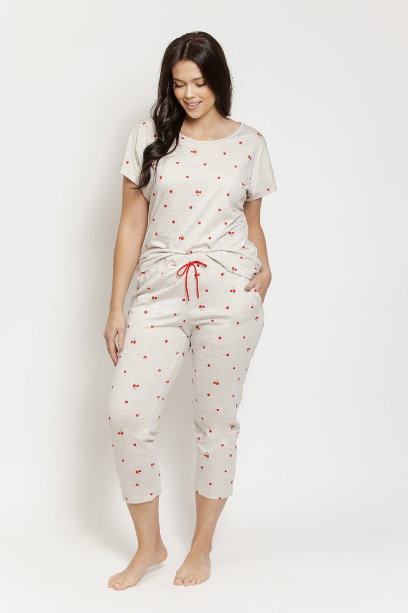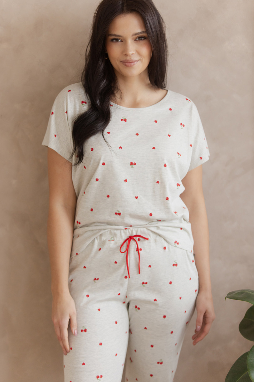 Жіноча бавовняна піжама з принтом у формі яблука. Комплект доповнений футболкою вільного крою з короткими рукавами, штанами довжини 7/8 зі зручними кишенями та декоративним еластичним поясом. Склад: 98% бавовна, 2% поліестер.