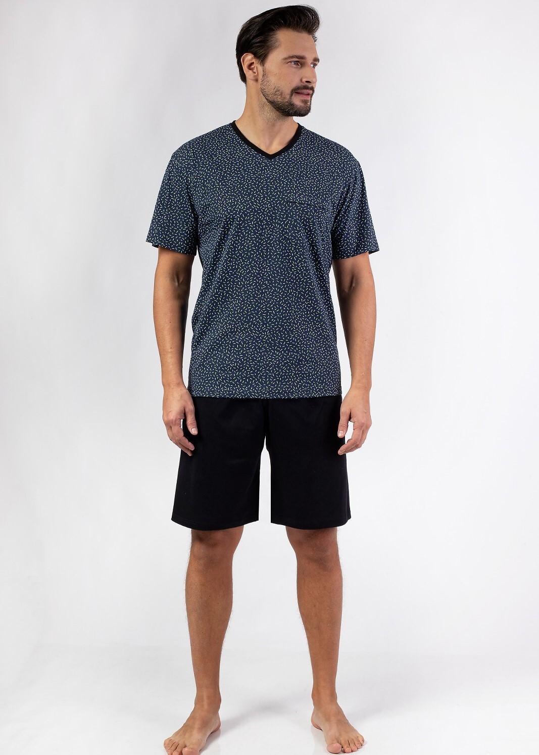 Чоловіча піжама з високоякісної бавовни. Футболка з малюнком з коротким рукавом і V-подібним вирізом на грудях. Короткі однотонні шорти. Склад: 100% бавовна