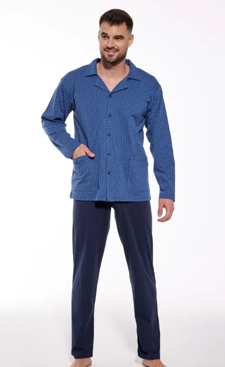 Чоловіча піжама з високоякісної бавовни. Сорочка на гудзиках з коміром і кишенями. Довгі одноманітні штани. Склад: 100% бавовна.