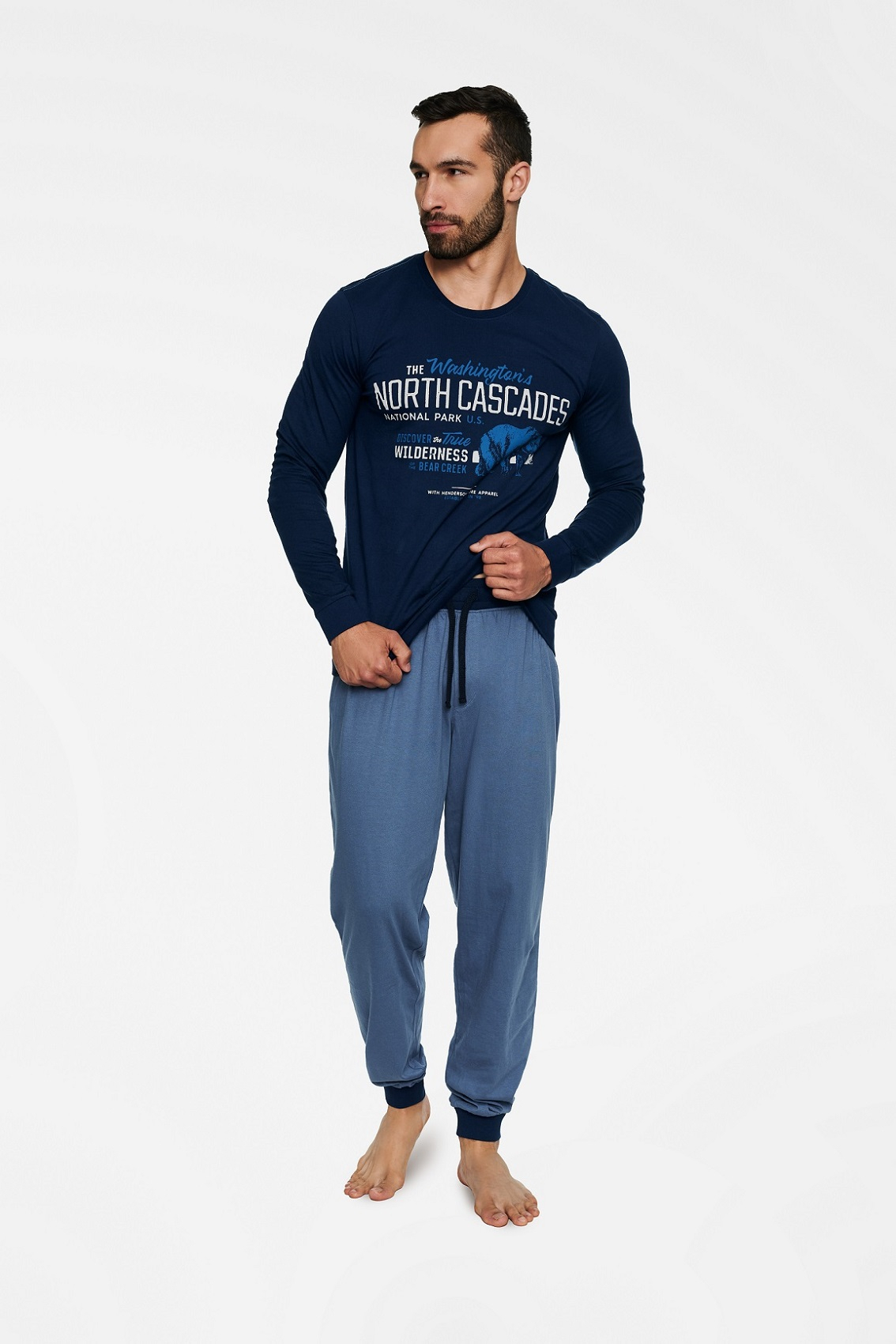 Чоловіча піжама з високоякісної бавовни. Гладка блуза з довгим рукавом, прикрашена написом та аплікацією. Гладкі довгі штани зі зручним рантом, які зав’язуються на талії шнурком. Склад: 100% бавовна.