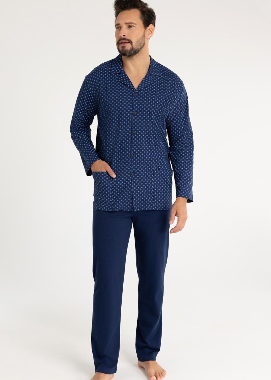Чоловічий піжамний комплект Regina 486 J/25 має класичний дизайн з елегантним, позачасовим характером. Верх доповнений сорочкою на ґудзиках з довгими рукавами, коміром та картатим візерунком. Практичні кишені на стегнах підвищують функціональність піжами. Комплект включає однотонні штани прямого крою для комфорту та свободи рухів. Виготовлений з високоякісної 100% бавовни, він м'який, дихаючий та приємний для шкіри. Це ідеальна піжама для прохолодних вечорів – стильний, практичний та неймовірно зручний.