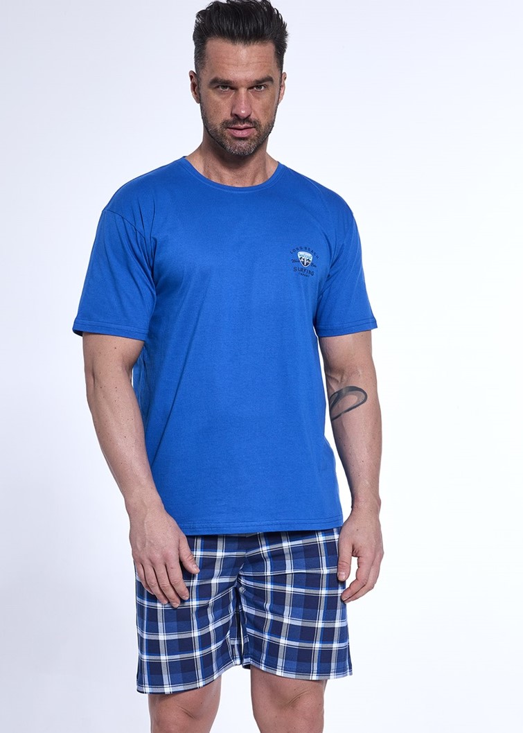 Чоловіча піжама KR 326/187 WEST COAST - класичний комплект, який поєднує комфорт і стиль. Виготовлений зі 100% натуральної бавовни, він м'який, повітряний і ідеально підходить для будь-якої пори року. Однотонна футболка має короткі рукави, круглий виріз і тонкий принт на грудях. Комплект доповнено вільними шортами в класичну клітку, що забезпечує повну свободу рухів. Зручний еластичний пояс робить піжаму ідеальною для вашої фігури. Ідеально підходить для чоловіків, які цінують комфорт і позачасовий дизайн. Склад: 100% бавовна