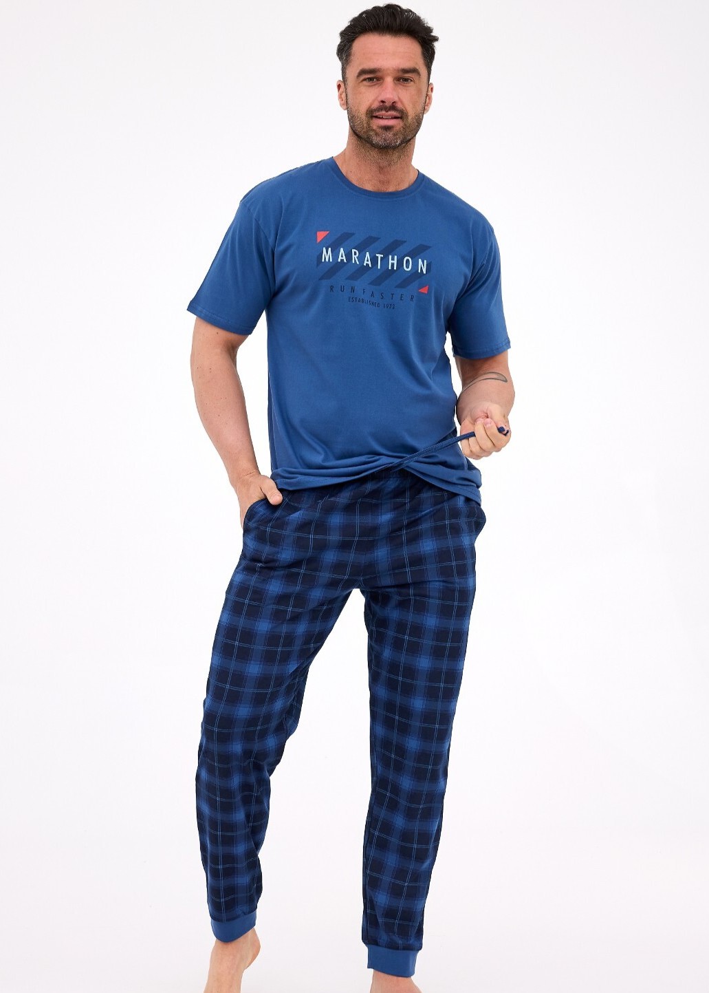 Чоловіча піжама KR 462/302 MARATHON 2 – сучасний комфорт та спортивний стиль. Чоловіча піжама MARATHON 2 – це функціональний та стильний комплект, виготовлений зі 100% високоякісної бавовни. Футболка з короткими рукавами та круглим вирізом прикрашена спортивним, барвистим принтом на грудях, що надає виробу динамічного характеру. Довгі штани в модний картатий візерунок мають практичні кишені, еластичні манжети та еластичний пояс зі шнурком для індивідуальної посадки. Це ідеальний вибір як для сну, так і для відпочинку вдома.