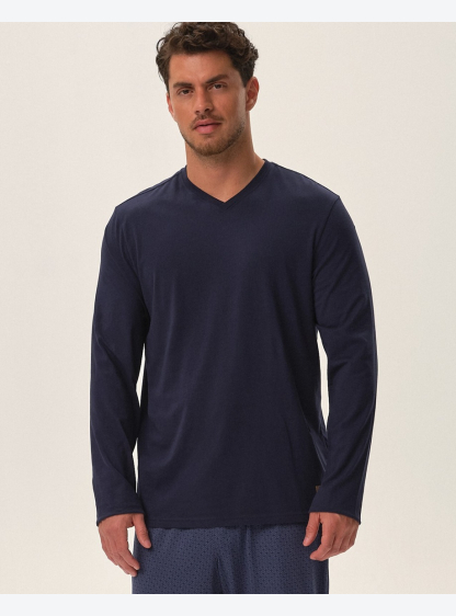 Бавовняна чоловіча піжама. Футболка з довгим рукавом, V-подібним вирізом і кишенею на рівні грудей. ..