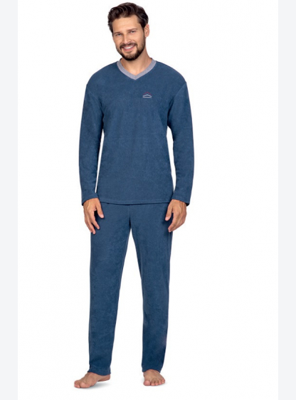 Чоловіча махрова піжама з довгим рукавом і довгими штанинами. Футболка має V-подібний виріз, прикраш..