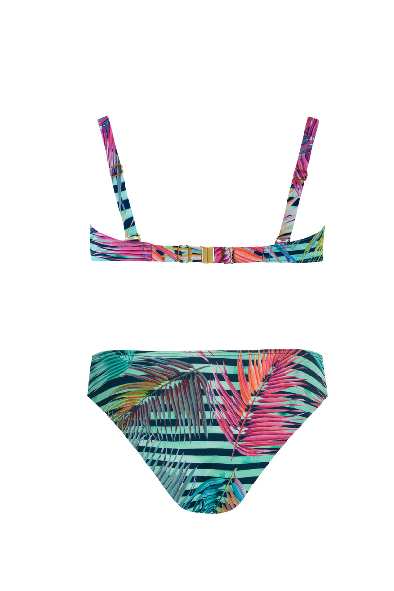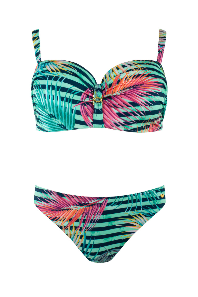 Купальник SAINT-TROPEZ 2 S730V1TR2 – це модель з двох частин, яка має винятково жіночний та екзотичний характер. Тропічний принт у яскравих кольорах у поєднанні з горизонтальними смужками створює ефектну, привабливу композицію. Жорсткі чашечки з кісточками забезпечують стабільну підтримку грудей, а вбудований пуш-ап оптично збільшує та моделює їх, додаючи привабливих пропорцій силуету. Модель розроблена для будь-якого типу грудей, також у розмірах plus size. Регульовані та знімні бретельки дозволяють індивідуально налаштувати розмір, а зручна застібка на спині гарантує комфорт носіння. Комплект включає класичні плавки з низькою талією, які красиво оголюють стегна та не обмежують рухів. Купальник ідеально підходить для пляжу та засмаги. Склад: 85% поліамід, 15% еластан