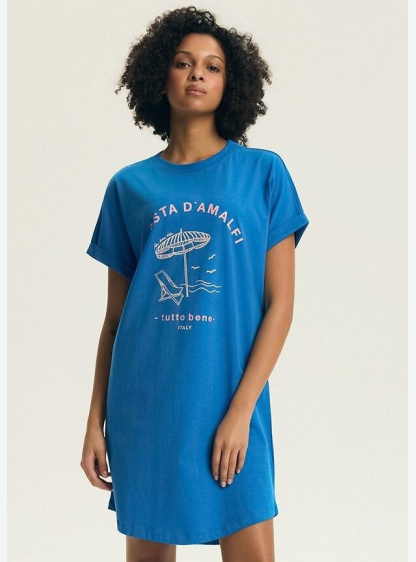 Жіноча м'яка бавовняна нічна сорочка вільного прямого крою з літнім принтом спереду. Короткі рукави,..