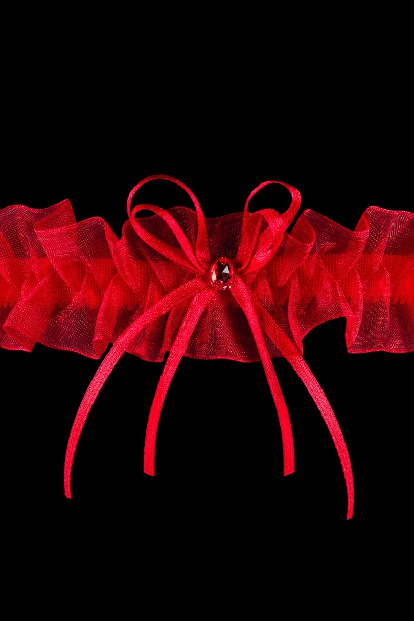 Ніжна, небесно-блакитна підв'язка з двох шарів фатину, прикрашена бантом тон у тон та кришталевою петелькою. Знизу вона має силіконову смужку, що надійно тримає форму. Ідеально підходить для доповнення весільного вбрання. Склад: 100% поліестер.
