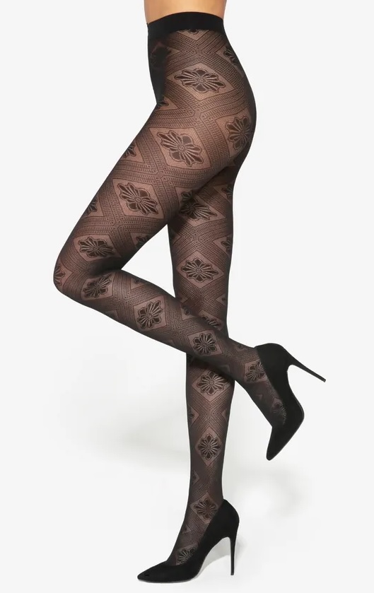 Колготки 40 DEN з квітковим мотивом. Гнучкі волокна та широкі ребра роблять колготки ідеально прилягаючими до тіла. Склад: 90% поліамід, 10% еластан.