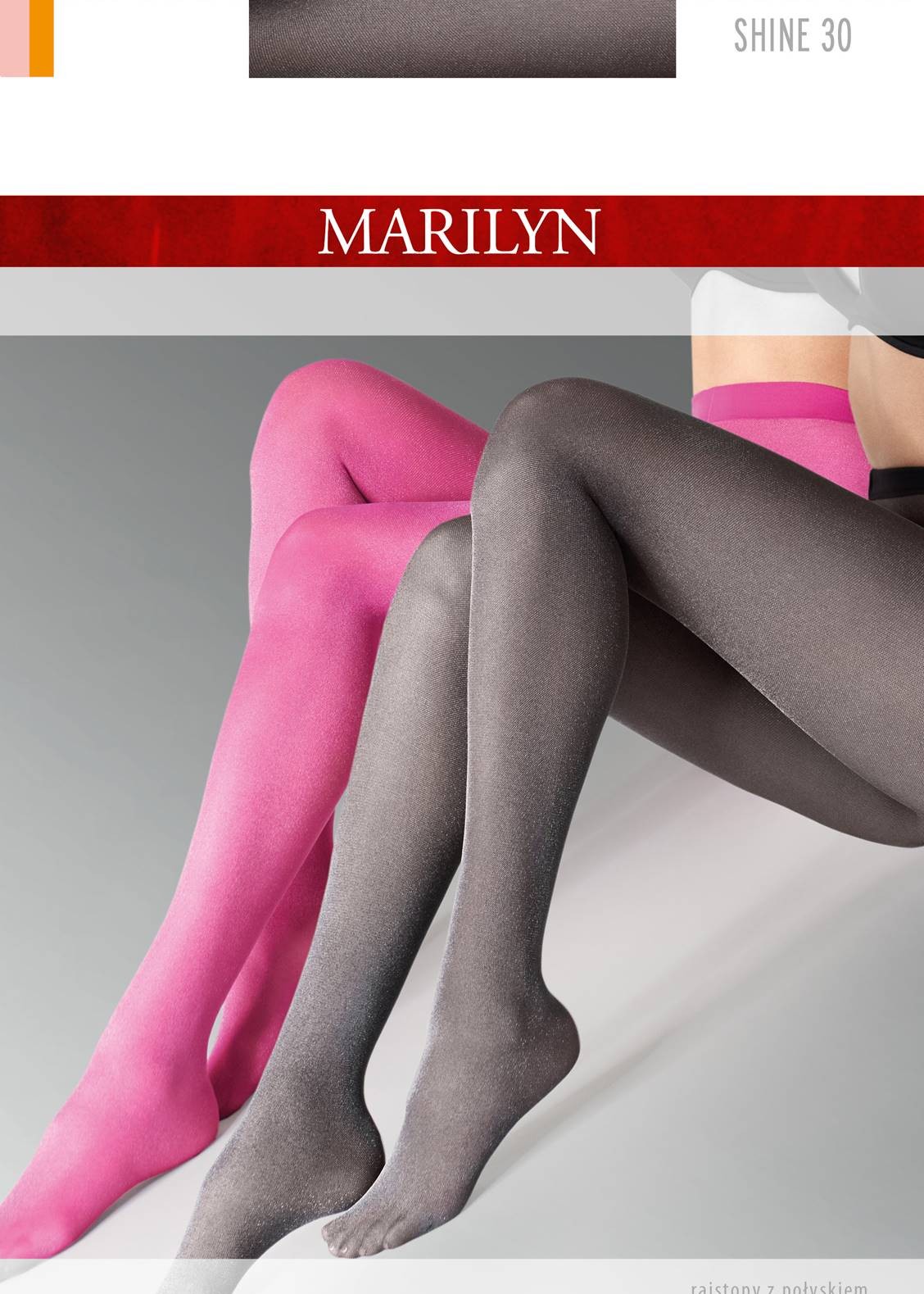 Ефектні жіночі колготки з товщиною 30 ден з інтенсивним блиском. Мають маленький клин, зручну гумку, плоский шов, невидиме підсилення пальців. Склад: 64% поліамід, 27% поліестер, 8% еластан, 1% бавовна.