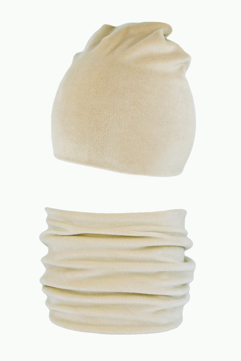 Жіночий велюровий комплект з гладкою шапочкою і шарфом. Надзвичайно м'який і приємний на дотик, добре пластичний матеріал. Склад: 100% поліестер.