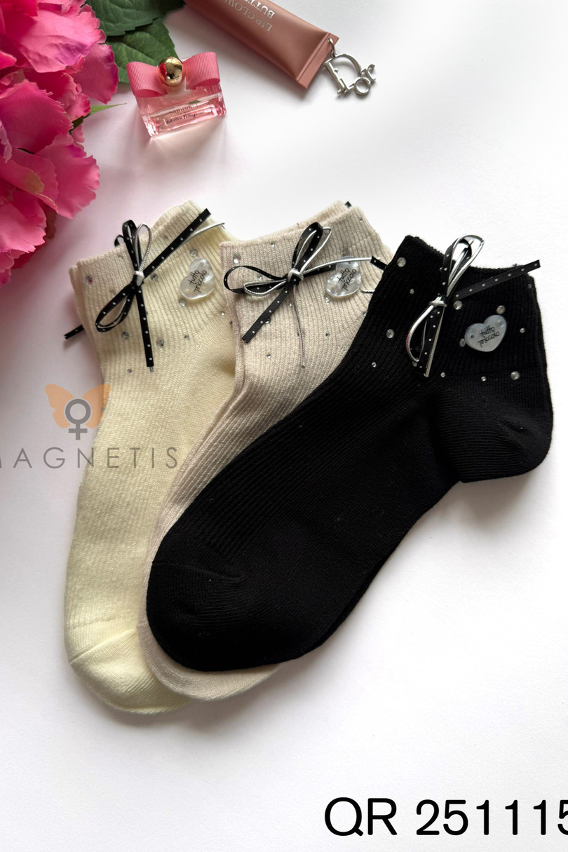 Жіночі шкарпетки Magnetis QR-251115 з аплікацією – це стильний та жіночний дизайн, який поєднує класичний силует із модними деталями. Декоративний бант контрастного кольору, ніжні мерехтливі стрази та декоративна підвіска у формі серця надають цим шкарпеткам унікального характеру. Вони є ідеальним аксесуаром для жінок, які цінують елегантність у повсякденному носінні. Високий вміст бавовни (92%) забезпечує природну повітропроникність, м’якість та комфорт протягом усього дня. Еластан (8%) забезпечує еластичність та ідеальну посадку, гарантуючи, що шкарпетки не будуть тиснути та ковзати під час ходьби. Матеріал міцний, стійкий до розтягування та зберігає свою естетику навіть після багаторазового прання. QR-251115 ідеально поєднуються з балетками, лоферами, кросівками та взуттям. Вони добре поєднуються з повсякденним, міським та елегантним одягом, створюючи модний акцент, який підкреслює індивідуальний стиль.
