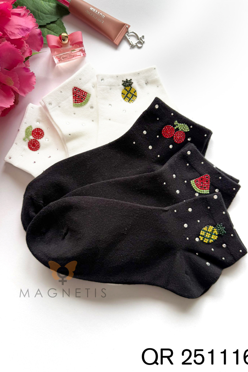 Жіночі шкарпетки з аплікацією Magnetis QR251116 03 – це стильний та жіночний аксесуар, який ідеально доповнить повсякденний одяг. Класичний білий колір прикрашений яскравою аплікацією у формі вишні та тонкими декоративними кристалами, що надає дизайну елегантності та модності. Ці візерунчасті шкарпетки ідеально підходять для жінок, які цінують оригінальні деталі. Високий вміст бавовни (92%) гарантує м’якість, повітропроникність та комфорт протягом усього дня. Додавання еластану (8%) забезпечує еластичність та ідеальну посадку, гарантуючи, що шкарпетки не ковзатимуть та зберігатимуть свою форму навіть після численних прань. Матеріал приємний до шкіри та стійкий до деформації. Модель QR251116 03 ідеально підходить для повсякденного та спортивного стилів, а також для модних образів з ноткою елегантності. Вони ідеально поєднуються з кросівками, балетками або лоферами. Шкарпетки з аплікацією Magnetis поєднують комфорт, якість та модний дизайн.