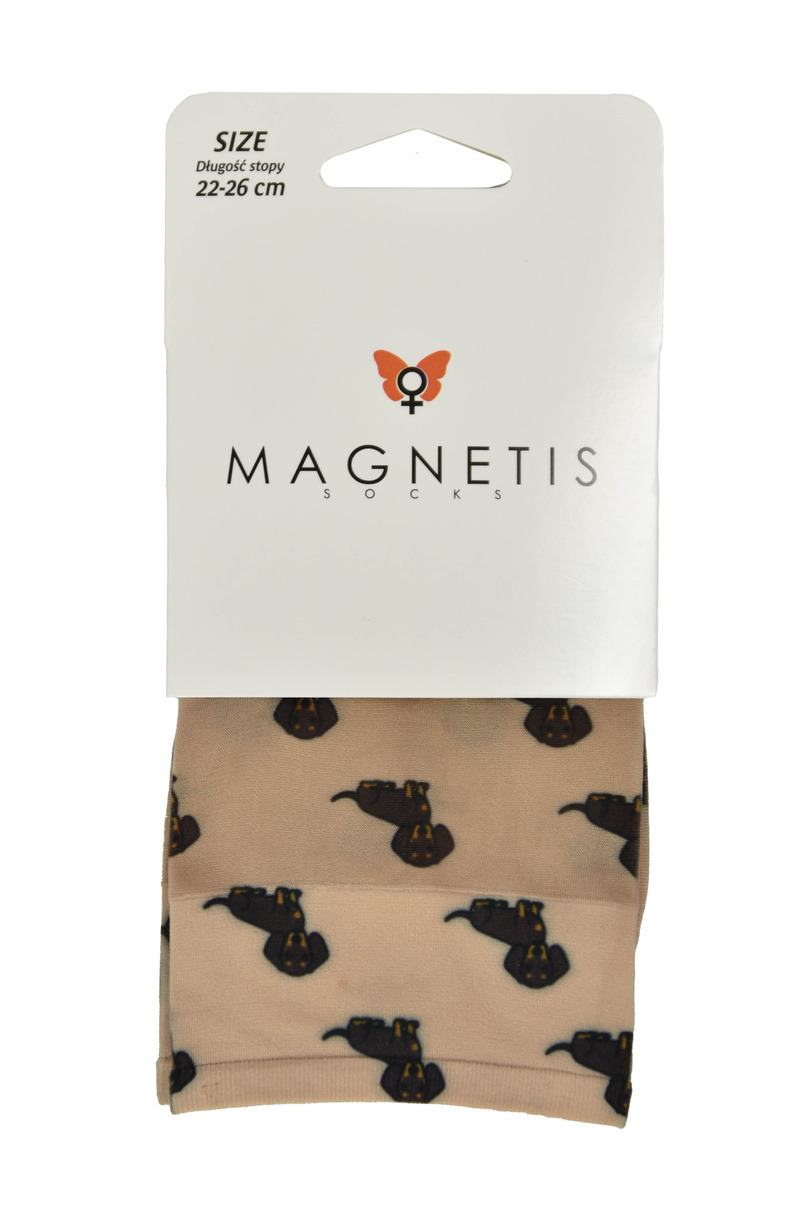 Додайте нотку гумору та оригінальності до свого вбрання з цими чарівними шкарпетками Magnetis 15 DEN. Бежева основа, прикрашена веселим мотивом такси, робить їх ідеальними для любительок тварин та жінок, які цінують унікальні аксесуари. Легка, напівпрозора тканина 15 DEN надає цим шкарпеткам витонченого вигляду, додаючи характеру будь-якому вбранню. Виготовлені з високоякісного поліаміду з додаванням еластану, вони міцні, зручні та ідеально адаптуються до стопи.