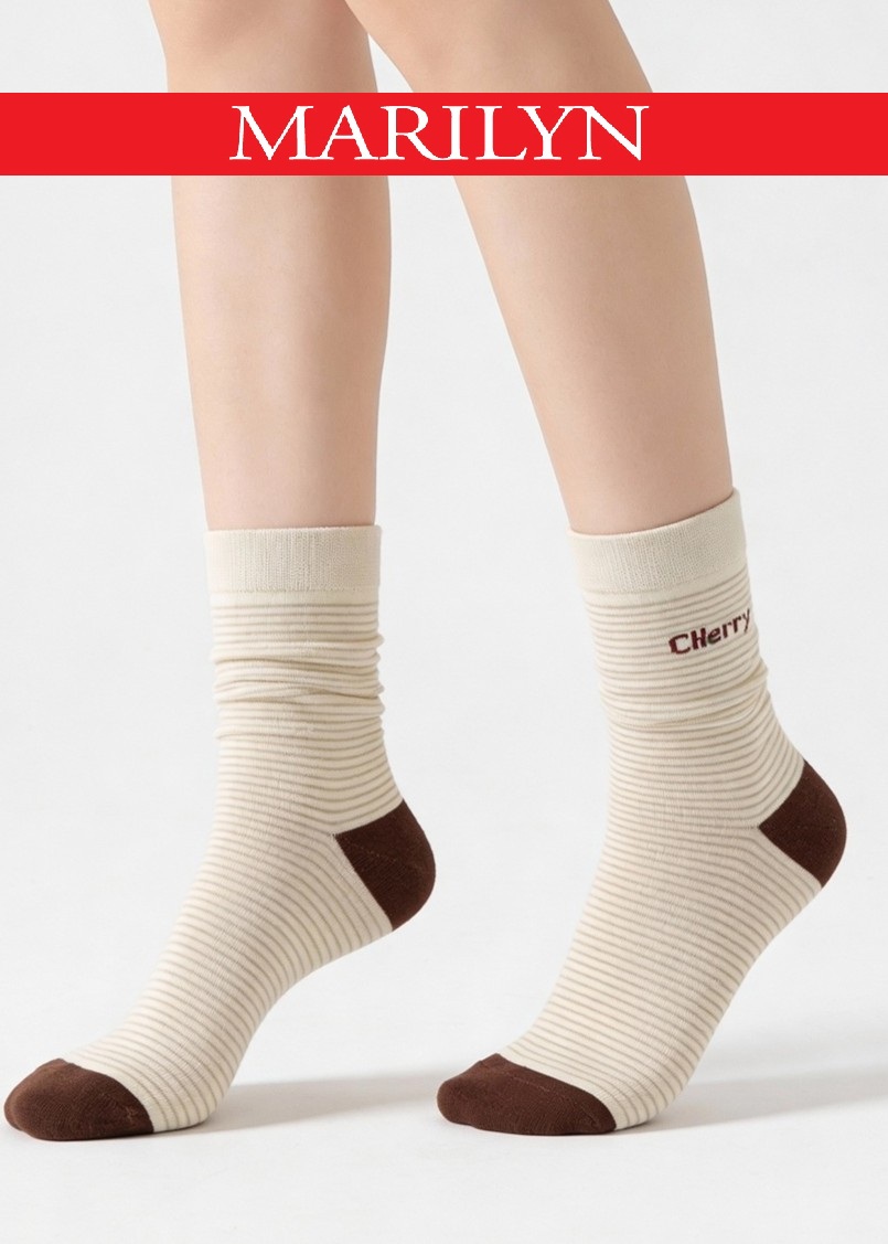 Жіночі шкарпетки з високоякісної бавовняної суміші. Оригінальний та модний дизайн з тонкими смужками, плоскими швами, еластичними манжетами та вищим вирізом. Склад: 80% бавовна, 15% поліамід, 5% еластан.