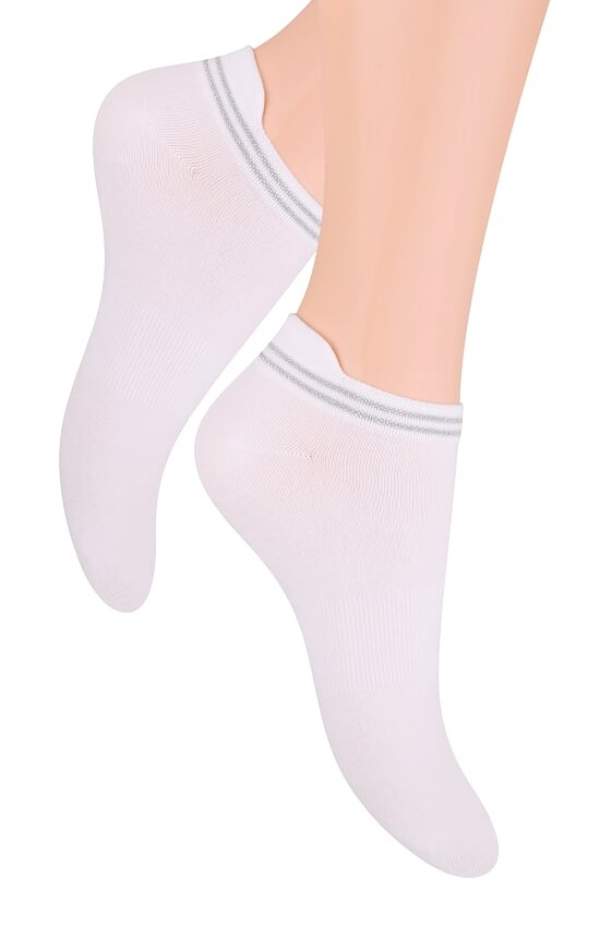 Жіночі ніжки з вкладкою на верху. Складається з 54% бавовни і 42% поліаміду з еластаном. Спеціальна конструкція запобігає зісковзуванню з лапки. У верхній лінії дві горизонтальні смужки з додаванням люрексової нитки.