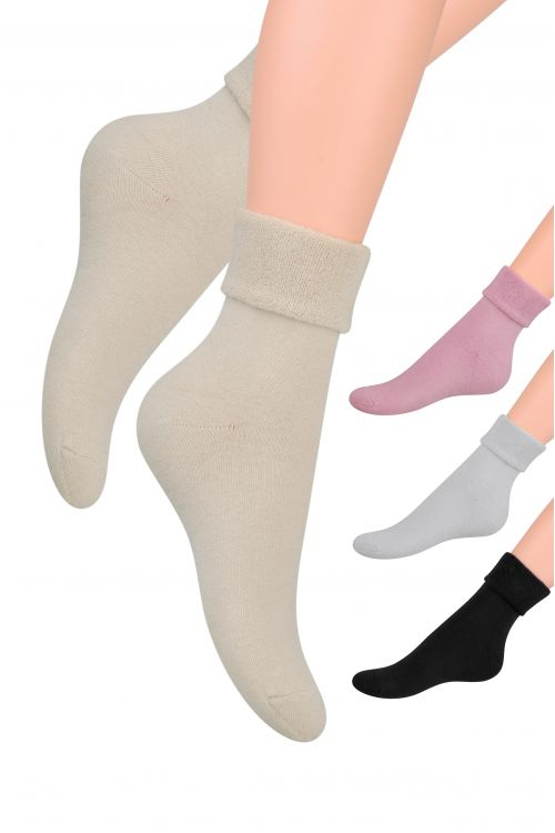 Гладкі жіночі махрові гольфи з підворотом. Виготовлений з бавовни найвищої якості. М'який і теплий, якраз для холодних зимових днів. Доступний в декількох кольорах.