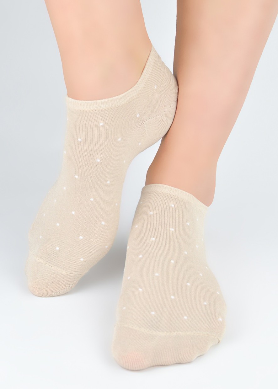 Зручні, однотонні жіночі шкарпетки в дрібний горошок, виготовлені з м'якого, приємного для шкіри модалу. Легкі та повітряні, вони мають еластичний пояс, що не стискає талії. Склад: 77% модал, 22% поліамід, 3% еластан.