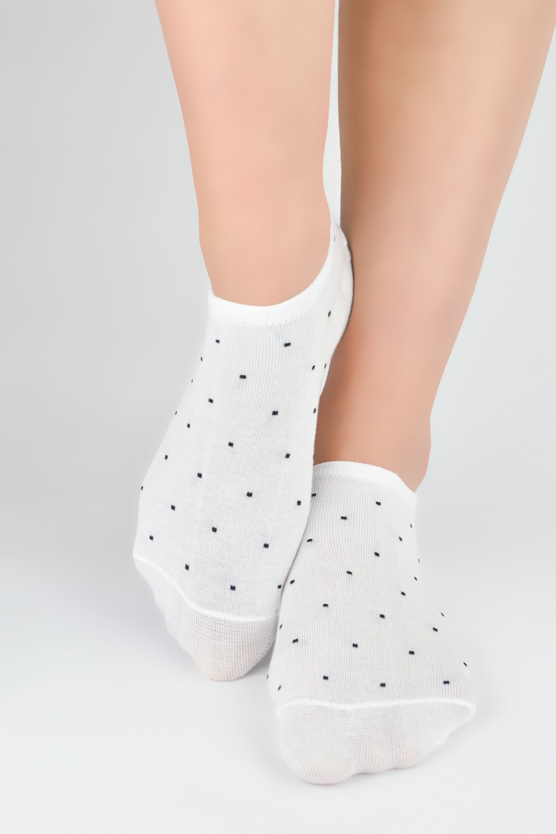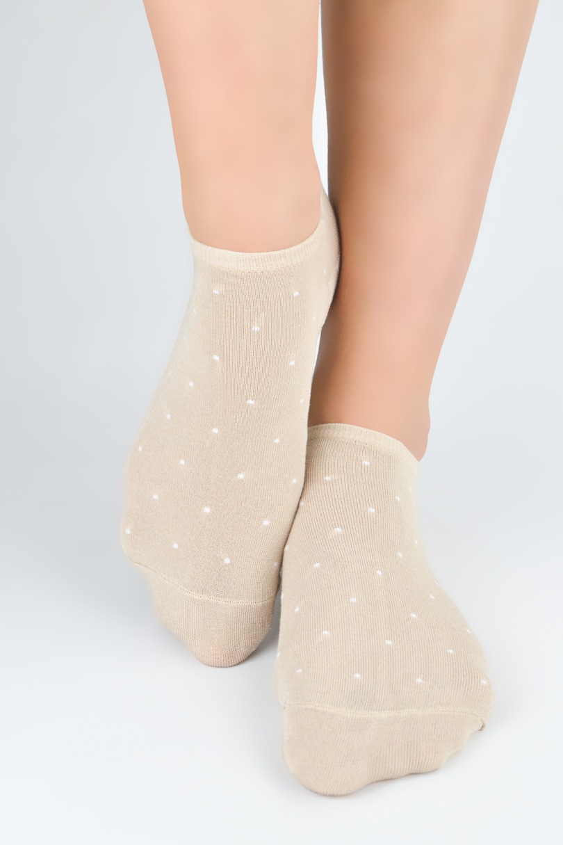 Зручні, однотонні жіночі шкарпетки з дрібним візерунком у горошок, виготовлені з м'якого, приємного для шкіри модалу. Легкі та повітряні, вони мають еластичний пояс, що не стискає талії. Склад: 77% модал, 22% поліамід, 3% еластан.
