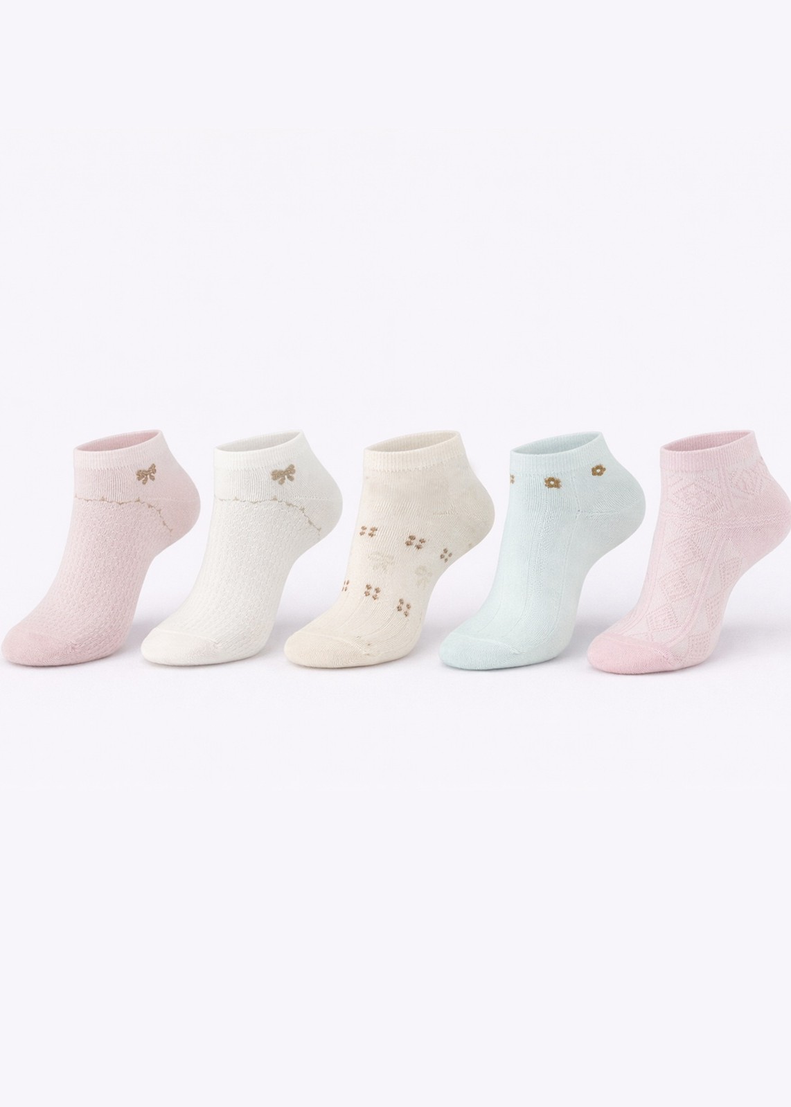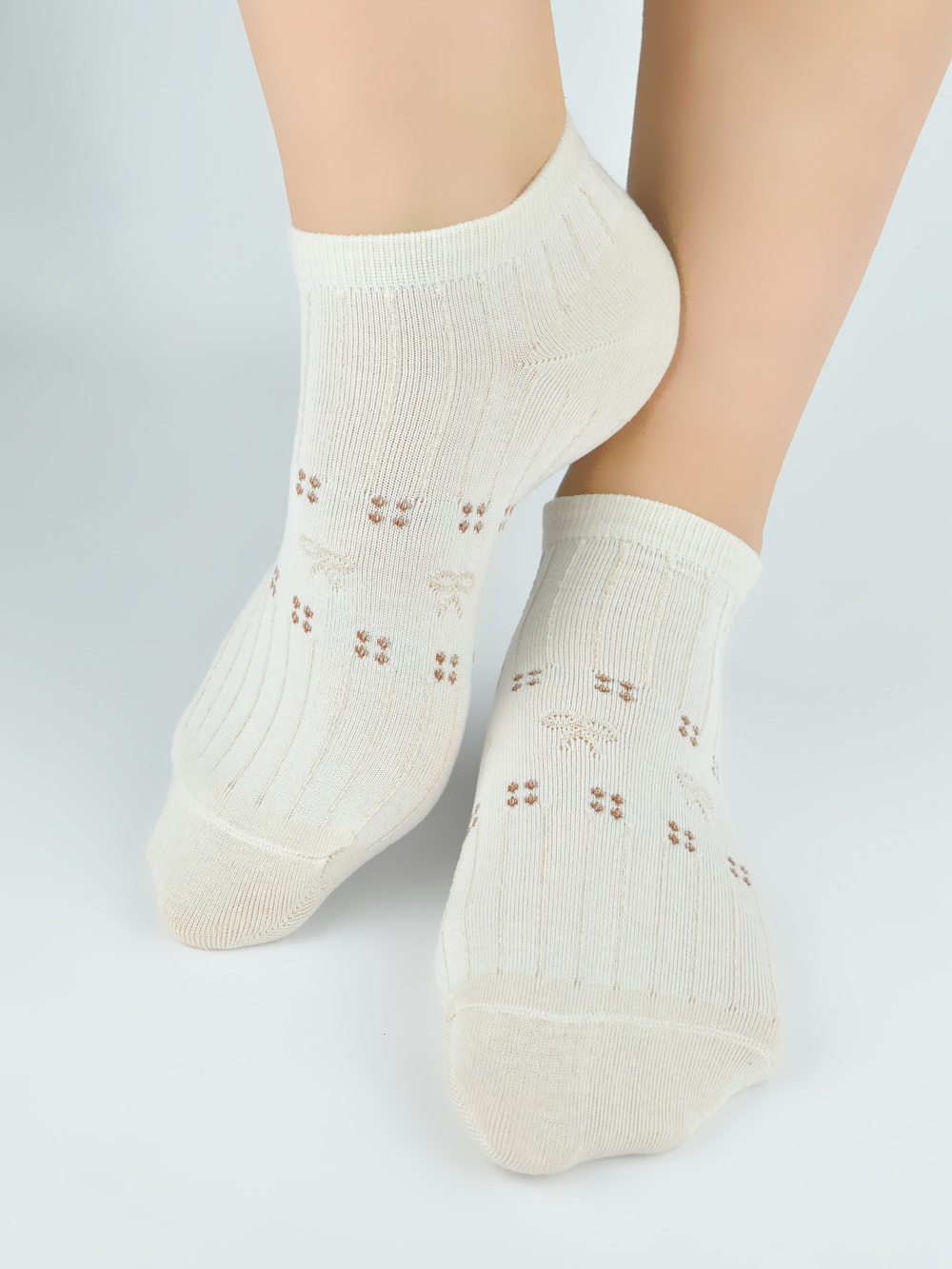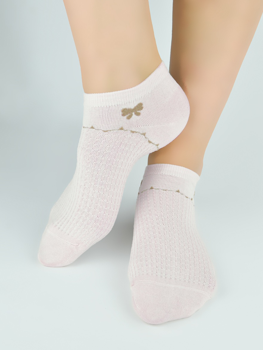 Зручні жіночі бавовняні шкарпетки. Вони ідеально облягають ногу, забезпечуючи комфорт, та прикрашені ніжними візерунками. Кольори у випадковому порядку. Склад: 75% бавовна, 22% поліестер, 3% еластан.