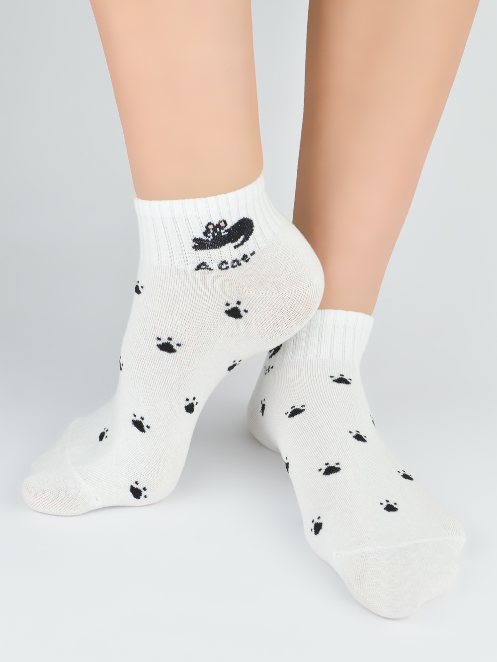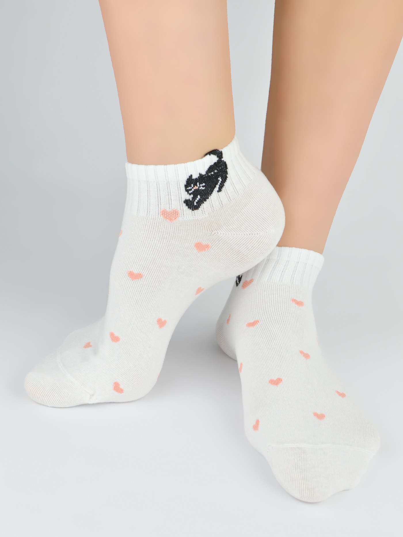 Зручні жіночі бавовняні шкарпетки. Вони ідеально облягають ногу, забезпечуючи комфорт, та прикрашені ніжними візерунками. Кольори у випадковому порядку. Склад: 75% бавовна, 22% поліестер, 3% еластан.
