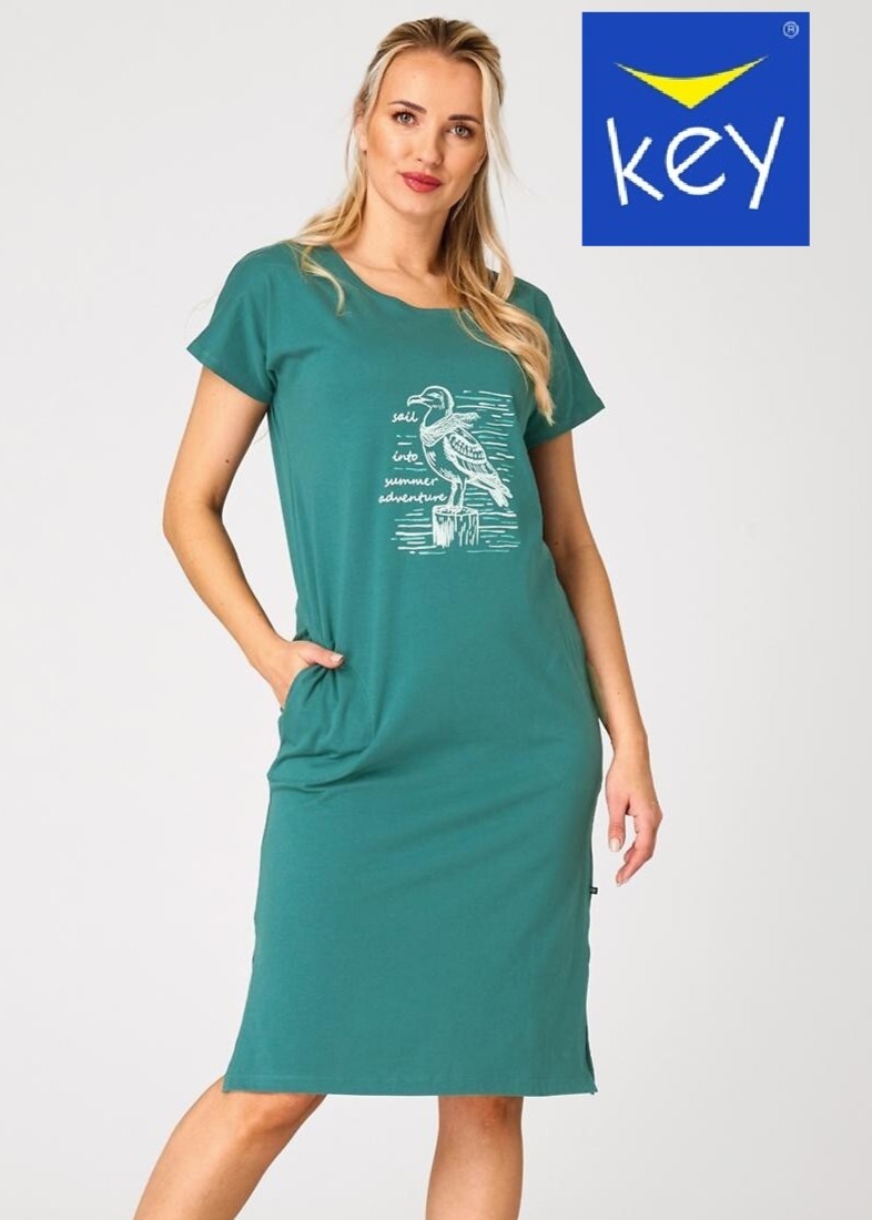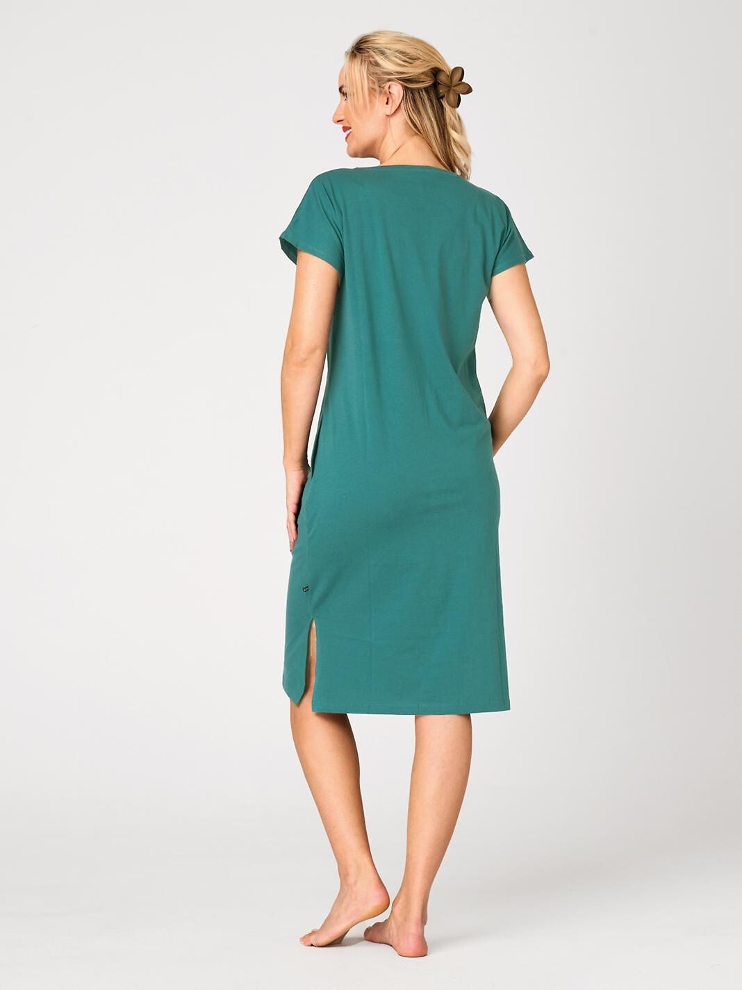 Ця жіноча бавовняна сорочка ідеально підходить для домашнього використання. Вона має декоративний принт на грудях, зручні кишені на стегнах, довжину до коліна та невеликі бічні розрізи. Склад: 100% бавовна.