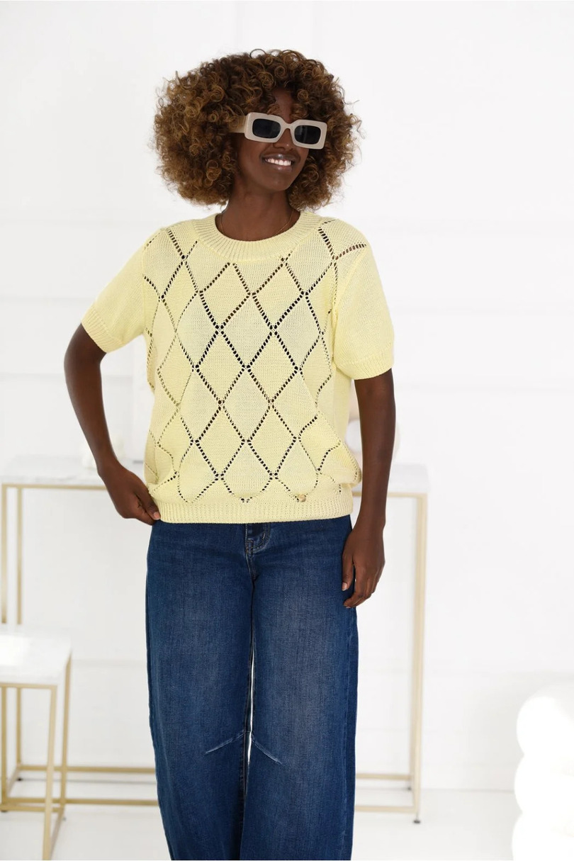 Цей стильний жіночий ажурний светр класичного, простого крою – ідеальний вибір для жінок, які цінують комфорт та позачасову елегантність. Ця модель з короткими рукавами та круглим вирізом ідеально підходить для щоденного носіння, забезпечуючи свободу рухів та універсальність. Витончений ажурний візерунок спереду надає светру сучасного вигляду, що дозволяє легко поєднувати його як з повсякденним, так і з більш елегантним одягом. Виготовлений з високоякісної суміші бавовни (50%) та акрилу (50%), светр м’який, приємний на дотик і добре драпірується. Матеріал міцний, стійкий до щоденного носіння та простий у догляді, що робить його практичним вибором для будь-якої події.