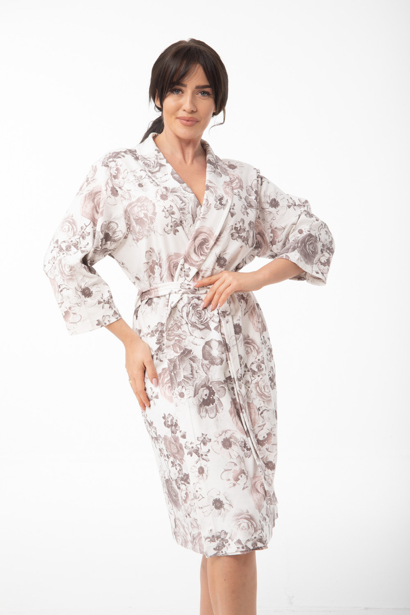 Жіночий халат з тонкої бавовни з квітковим візерунком. Зав'язки на талії, кишені на стегнах та рукави 7/8 довжини. Склад: 100% бавовна