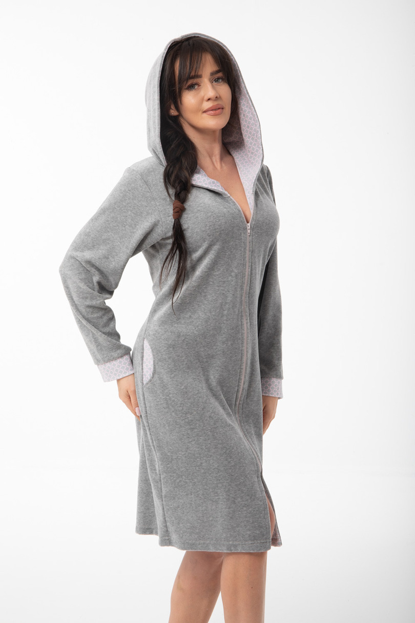 Жіночий халат Dorota FR-373 – це практичний та стильний варіант для жінок, які цінують комфорт та сучасний дизайн. Його короткий капюшон ідеально підходить як для використання після купання, так і для щоденного відпочинку вдома. Зручна блискавка забезпечує швидке та легке одягання. Халат виготовлений з високоякісної тканини, що складається з 80% м’якої, дихаючої бавовни та 20% міцного поліестеру. Таке поєднання гарантує тепловий комфорт, довговічність та стійкість до частого прання. Матеріал приємний на дотик та забезпечує комфорт протягом усього дня. Капюшон та рукави оброблені контрастною тканиною, що надає моделі сучасного та спортивного характеру. Практичні кишені на рівні стегон підвищують функціональність халата. Dorota FR-373 – ідеальний вибір як халат після купання, зручний одяг для дому або теплий шар одягу для прохолодних ранків.