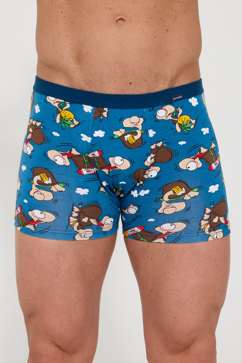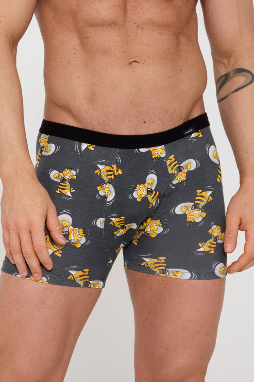 Чоловічі бавовняні шорти з яскравим, грайливим візерунком. Приталені плоскі шви, зручний еластичний пояс з бавовняною обробкою та манжети на штанинах, що не тиснуть. Склад: 95% бавовна, 5% еластан.
