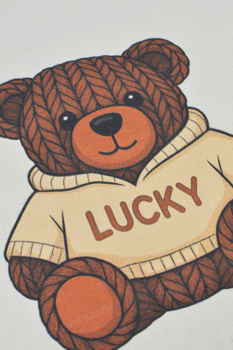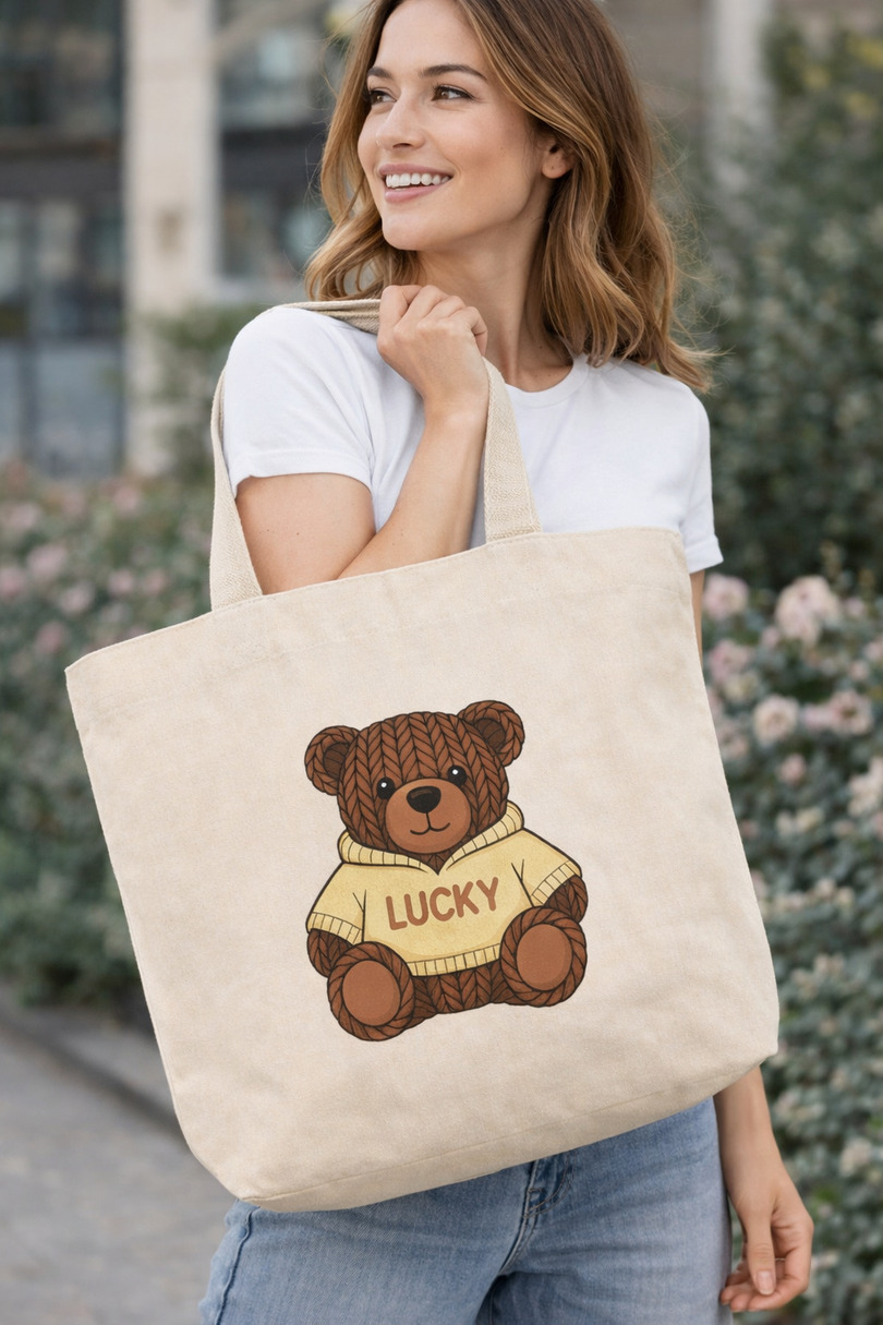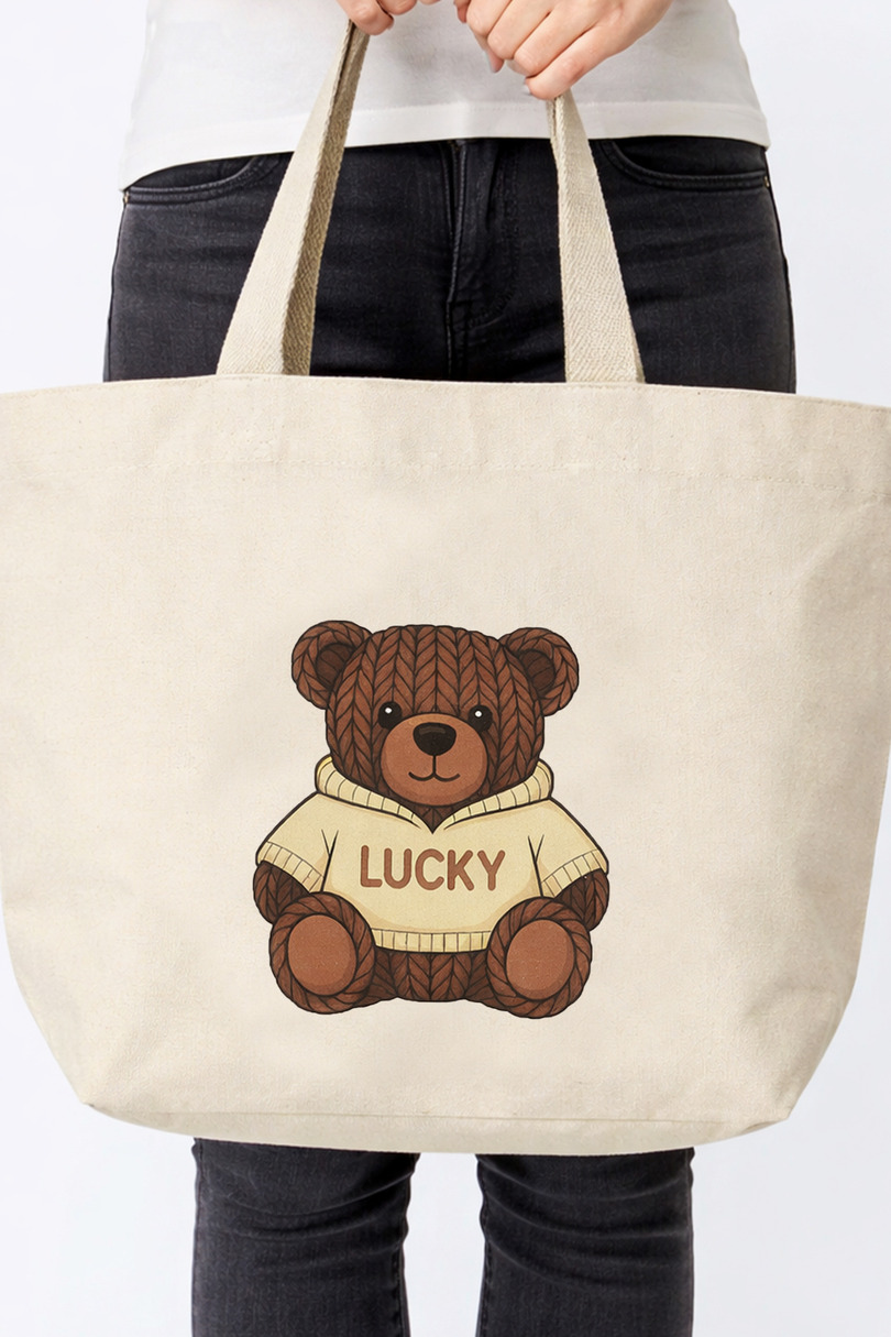 Ця велика бавовняна сумка для покупок із принтом ведмедика — практичний та стильний аксесуар, ідеальний для щоденного використання. Виготовлена з міцної бавовни, сумка є екологічно чистою, довговічною та багаторазовою, що робить її ідеальною для покупок, прогулянок чи подорожей. Чарівний принт ведмедика спереду надає сумці унікального та модного характеру. Просторий внутрішній відділ дозволяє зберігати покупки, книги чи інші необхідні речі, а зручні, міцні ручки дозволяють комфортно носити сумку на плечі або в руці. Це чудовий вибір для тих, хто цінує функціональність, стиль та екологічні рішення. Ширина: 60 см, висота: 40 см.