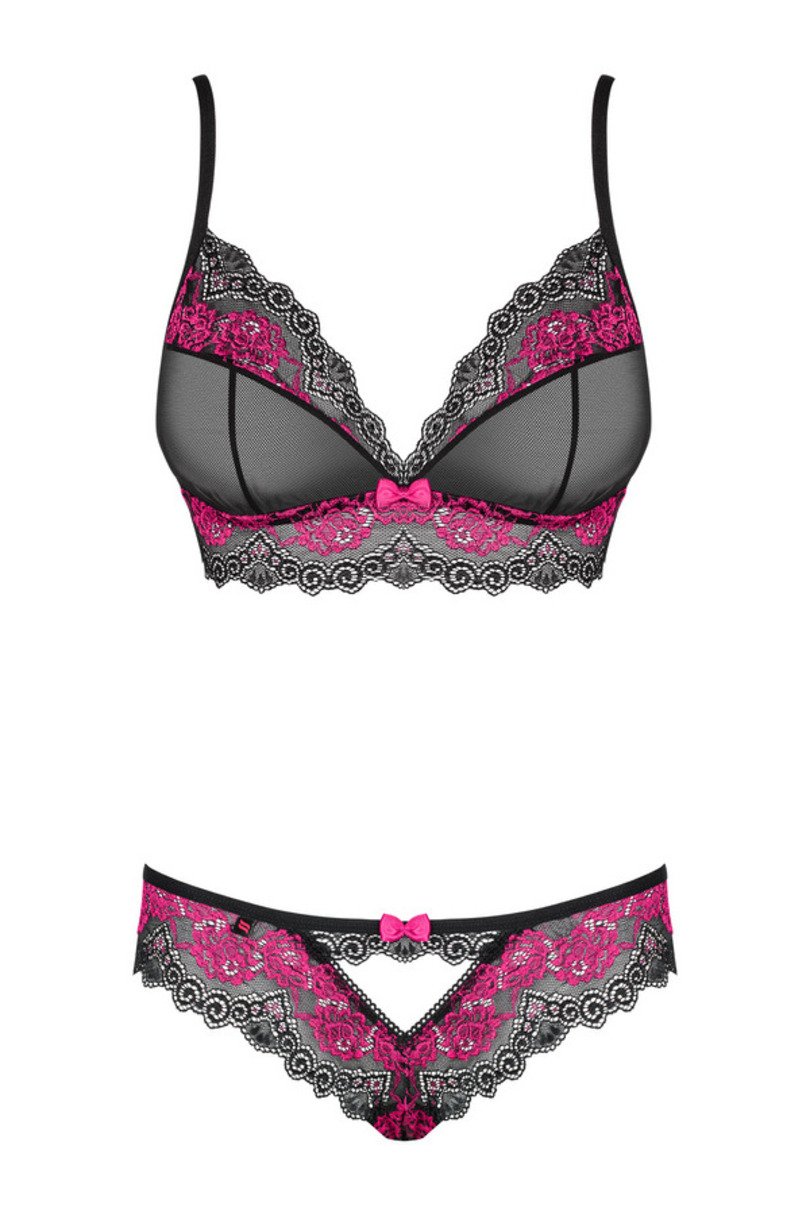 Цей чуттєвий комплект білизни в чорному та насиченому рожевому кольорах поєднує елегантність, жіночність та комфорт. Ніжне мереживо з мотивом троянди ніжно драпірує силует, створюючи неймовірно яскравий та спокусливий образ. Бюстгальтер з м'якими чашечками чудово формує та природно підкреслює груди, забезпечуючи комфорт протягом дня чи вечора. Регульовані бретельки та багатопозиційна застібка забезпечують ідеальну посадку. Трусики ComfyCut вражають своїм комфортом та ідеальною посадкою – спокусливий виріз спереду та мереживо ззаду підкреслюють сідниці та додають нотку сексуальності. Солодкі рожеві банти додають чарівний, привабливий акцент. Гнучка тканина Multistretch забезпечує ідеальну посадку, гарантуючи комфорт та свободу рухів.