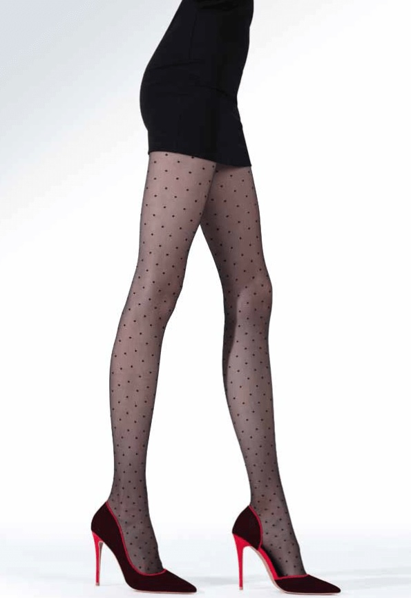 Жіночі колготки, прикрашені візерунком в горошок. Виготовлена з плетеної пряжі з спандексу. Без помітної трусикової частини, з невеликою ластовицею. Склад: 88% поліамід, 11% еластан, 1% бавовна.