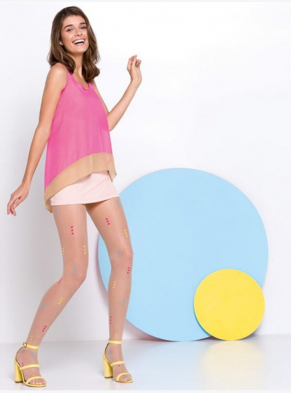 Жіночі колготки з ніжним точковим візерунком, оброблені горизонтальною лінією, що імітують панчохи. ..