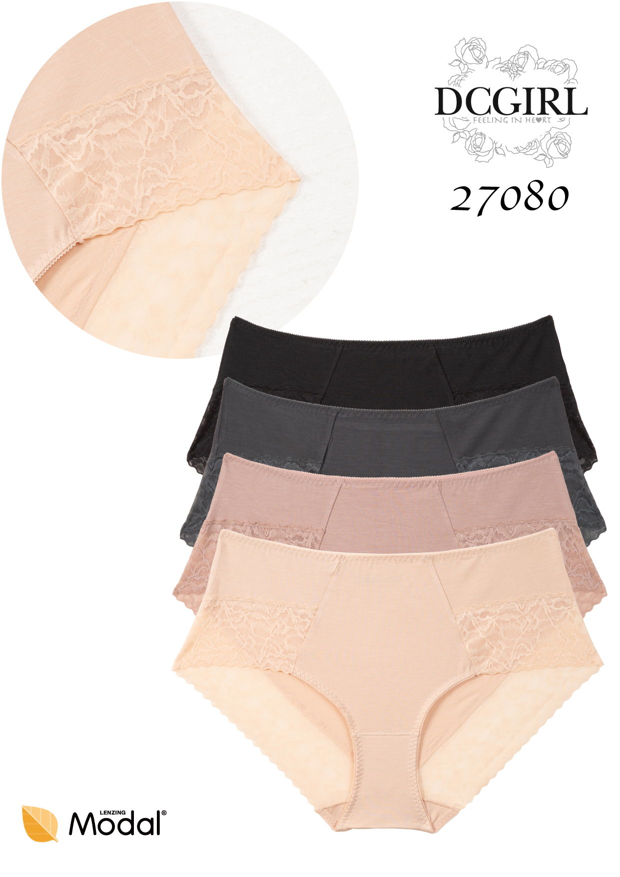 Жіночі труси з високоякісного модалу. Декоровані ніжними мереживними вставками на стегнах та сідницях. Надзвичайно м'які та приємні на дотик. Упаковані в упаковки по 12 штук у міксі кольорів та розмірів (S, M, L, XL). Склад: 94% модал, 6% еластан.